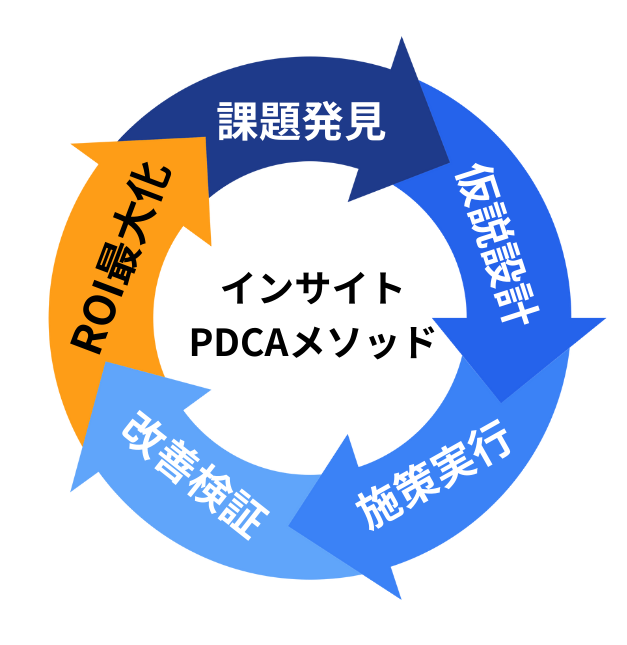 ブルーイージスの「インサイトPDCAメソッド」は、常に数値を可視化し、改善を積み重ねる仕組みです。数字から見えてくる課題を発見し、どう解決すべきかを見極める本質的な課題設定力が強みです。成果に直結する改善を積み重ね、成果を伸ばし続けることでROIを最大化します。